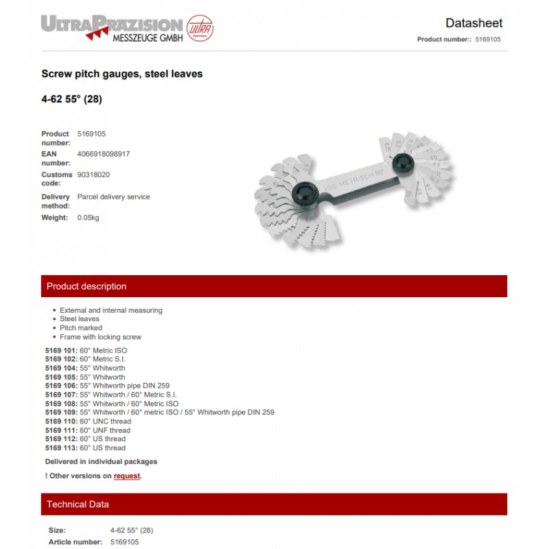 Wzorzec zarysu gwintu 4-62 mm 55° 28 listków ULTRA PRAZISION ze świadectwem wzorcowania
