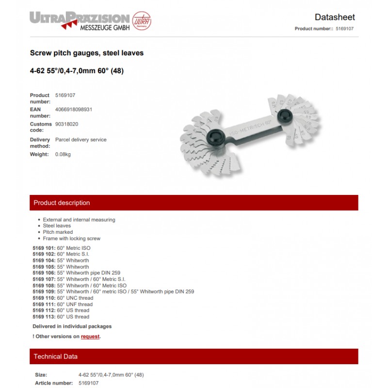 Wzorzec zarysu gwintu 4-62 mm 55°/ 0,4-7,0 mm 60° 48 listków ULTRA PRAZISION ze świadectwem wzorcowania