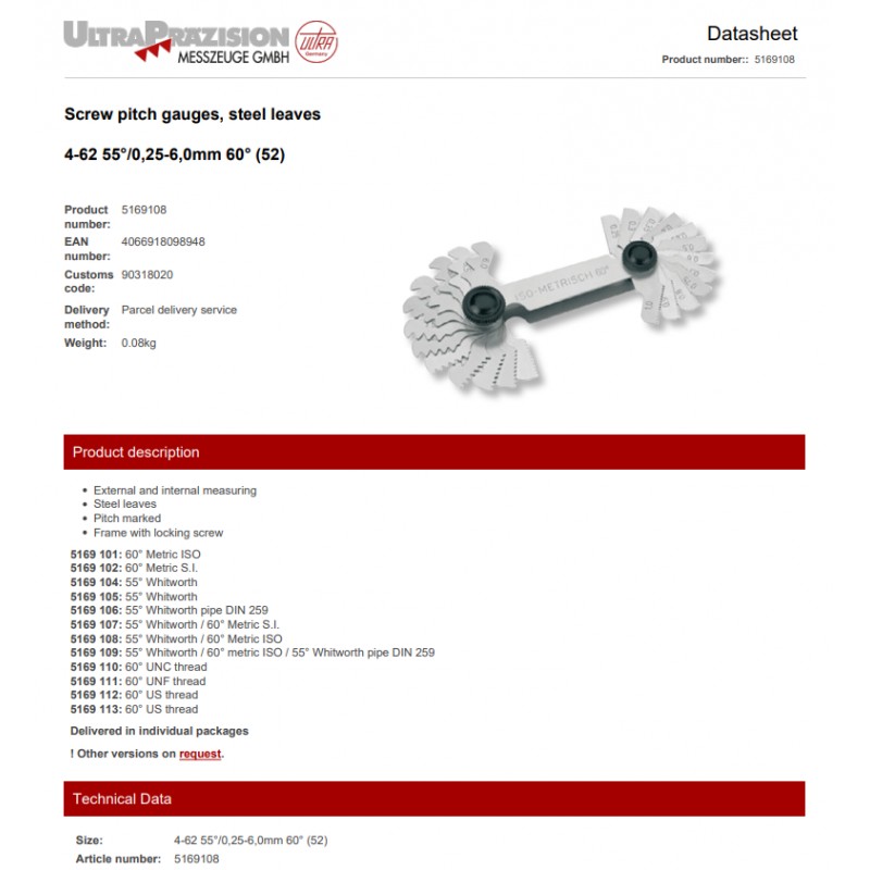 Wzorzec zarysu gwintu 4-62 55°/0,25-6,0mm 60° 52 listki ULTRA PRAZISION ze świadectwem wzorcowania
