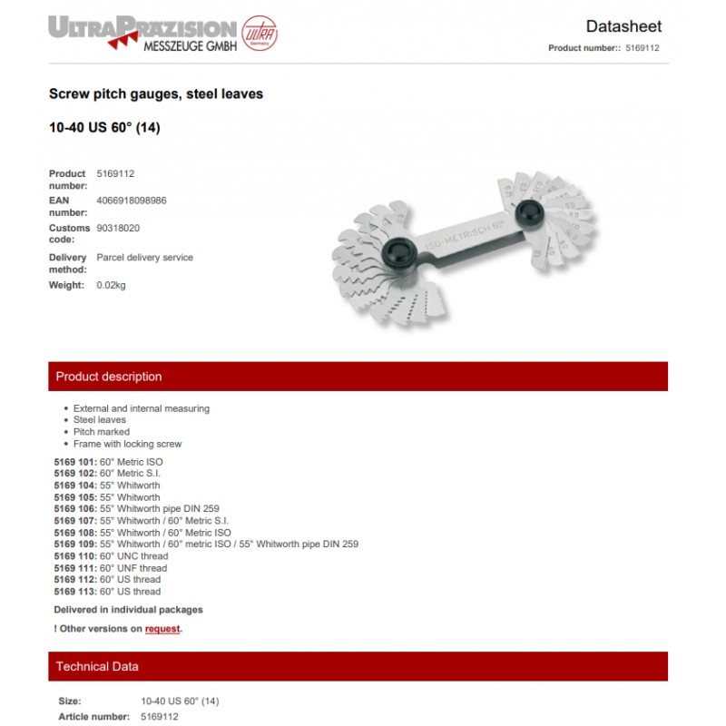 Wzorzec zarysu gwintu 10-40 US 60° 14 listków ULTRA PRAZISION ze świadectwem wzorcowania
