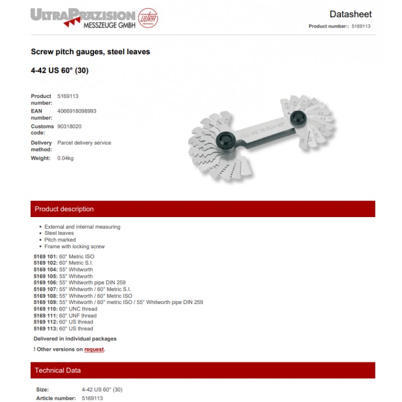 Wzorzec zarysu gwintu 4-42 US 60° 30 listków ULTRA PRAZISION ze świadectwem wzorcowania