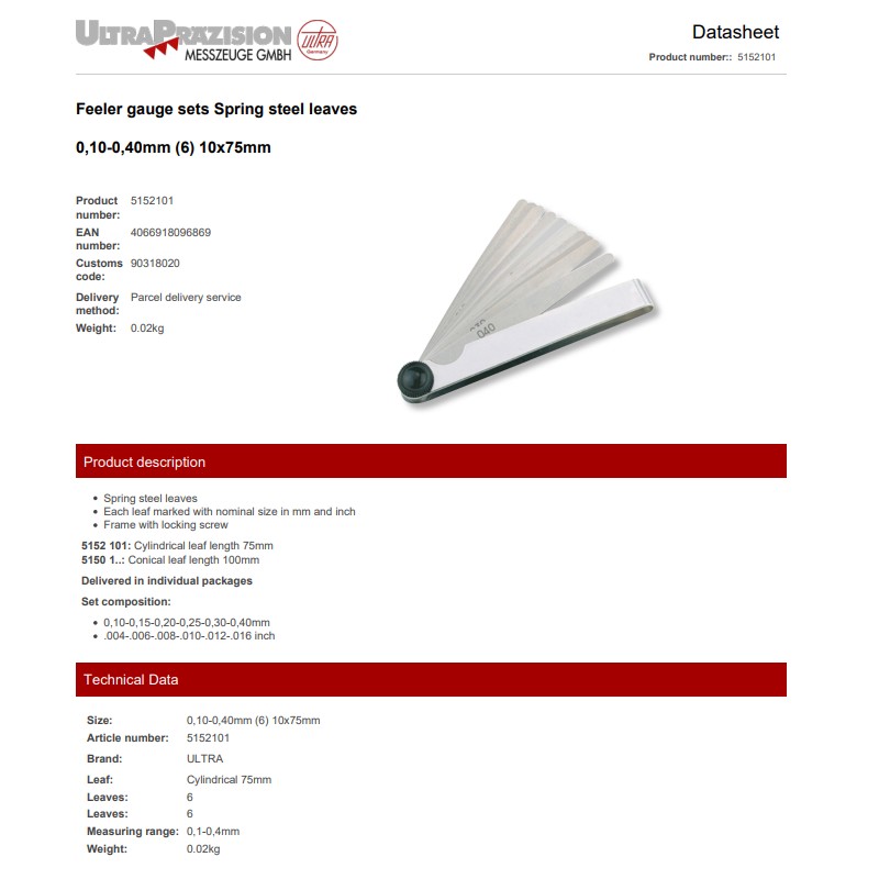 Szczelinomierz listkowy 0,10-0,40 mm 6 płytek 75 mm ULTRA PRAZISION ze świadectwem wzorcowania