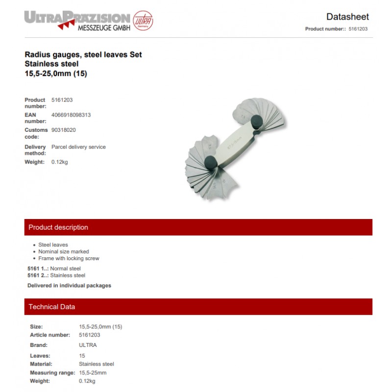 Wzorce promieni 15,5-25,0 mm 15 listków ze stali nierdzewnej ULTRA PRAZISION ze świadectwem wzorcowania